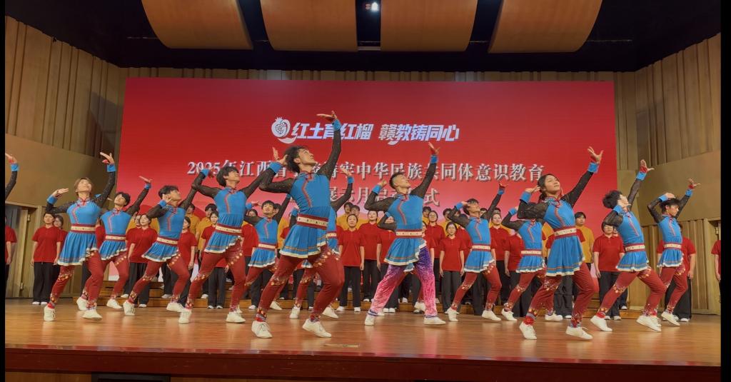 9月16日,2025年“江西省学校铸牢中华民族共同体意识教育宣传展示月”启动仪式在南昌举行。我校啦啦操队受邀参加仪式演出,以一场精彩纷呈的民族健身操表演,生动诠释了中华民族多元一体的文化魅力和当代青年昂扬向上的精神风貌。本次活动由中共江西省委统战部、江西省教育厅、江西省民族宗教事务局联合主办,华东交通大学承办。